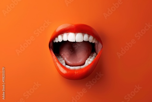 © vuang, Naklejka premium Close-up of vibrant red lips on orange background