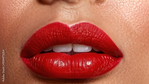 Obraz premium Close-up of vibrant red lips showcasing glossy lipstick and white teeth.