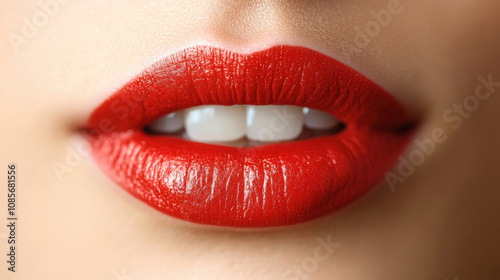 Obraz premium Close up of vibrant red lips with glossy finish, showcasing perfect smile and...