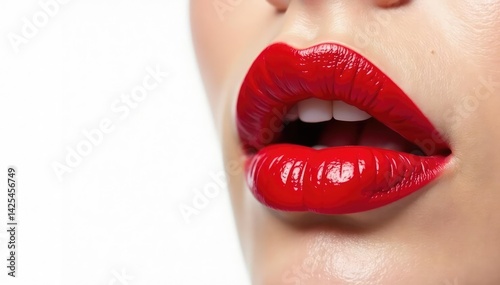 © ຈໍາປາ ຈໍາປາ, Obraz premium Close-up of vibrant red lipstick on pure white , pout, red lips, sensual