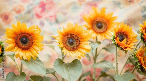 © Dot, Obraz premium Close up of vibrant sunflowers with bright yellow petals set against a soft floral background