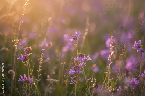 © The 2R Artificiality, Naklejka premium Close-up of vibrant wildflowers in a field during golden hour with blurred background