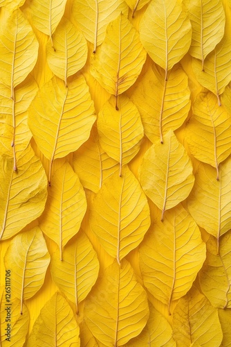 © BerkahStock, Obraz premium Close-up of vibrant yellow autumn leaves arranged in a repeating pattern on a yellow background.