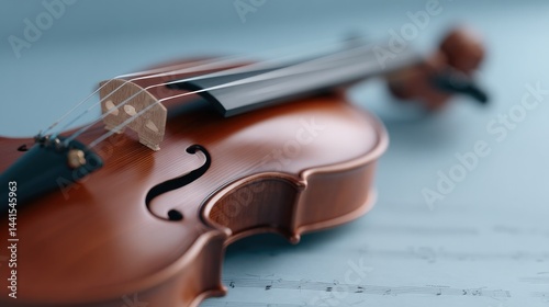 Fototapeta premium close-up of violin resting on serene sheet music with soft shadows...