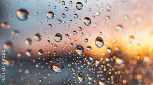 Fototapeta premium Close-up of water droplets on a glass surface, reflecting a beautiful sunset...