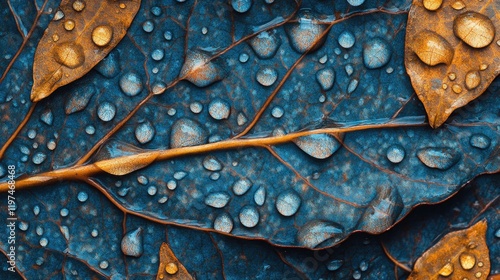 Fototapeta premium Close-up of water droplets on colorful leaves with rich textures and contrasting colors Copy Space