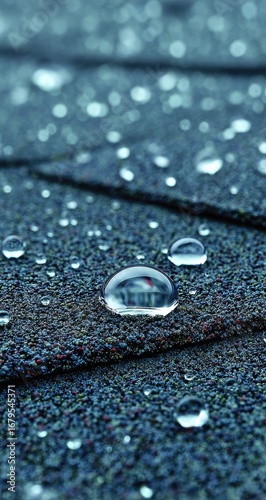 Fototapeta premium Close-up of water droplets on textured dark surface. Reflecting a miniature...