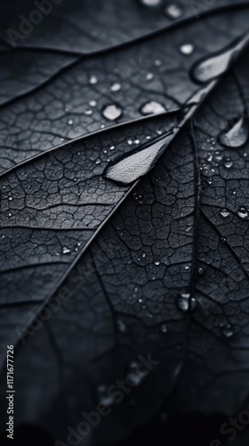 © Rennyks, Fototapeta premium Close-up of water drops on A Black autumn leaves showing veins and textures wallpaper for phone