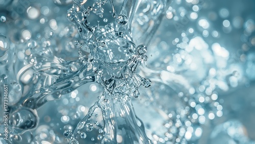 © Sona, Fototapeta premium Close-up of water splashing with bubbles and ripples, showing fluid motion and transparency.