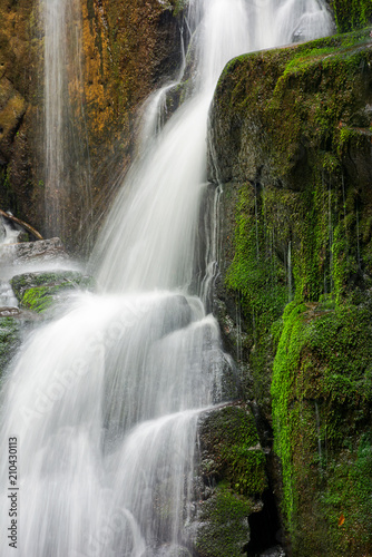 © Pellinni, Obraz premium close up of waterfall cascade over the mossy rock. beautiful calm nature background. freshness and power of water. clear environment and resources concept