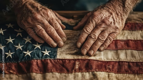 © I Have Photos, Fototapeta premium Close-Up of Weathered Hands on Vintage American Flag Fabric