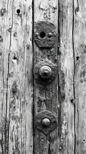 © Wawastock, Fototapeta premium Close-up of weathered wood planks with three aged metal fasteners.