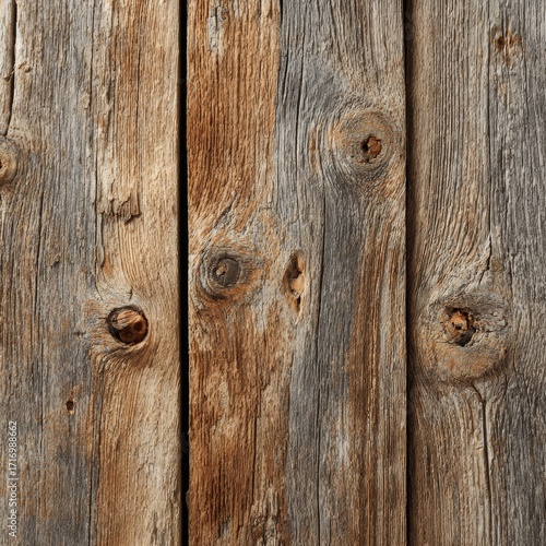 © Ouzhan, Naklejka premium Close-up of weathered wooden planks, showing intricate textures and knots. The natural grains and colors create a rustic aesthetic.