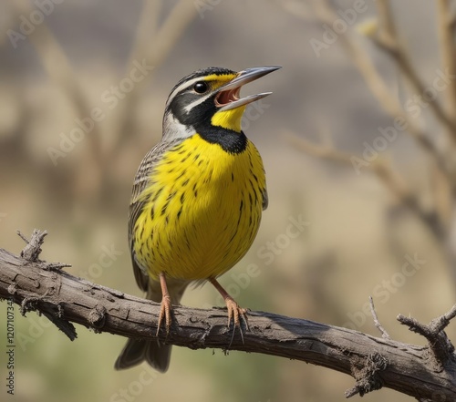 Naklejka premium Close-up of western meadowlark singing on dry branch, bird, feathers, wildlife