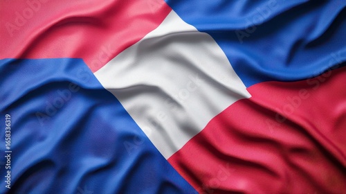 © warunthorn, Fototapeta premium Close-Up of White and Red Flag with Blue Sections in Textured Fabric