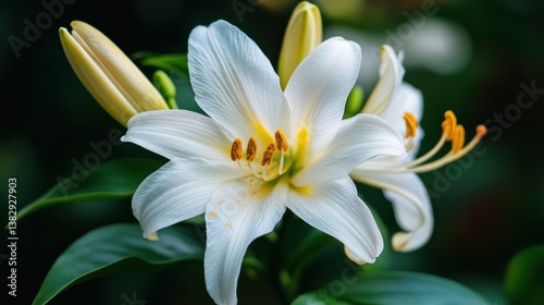Fototapeta premium Close-up of white lilies in garden setting, botanical