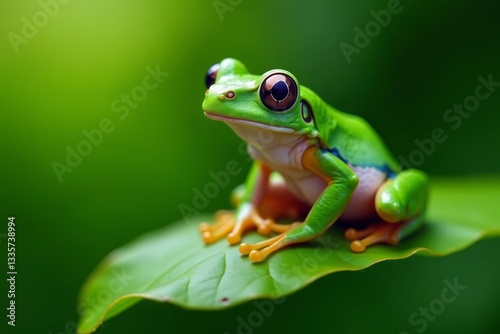 © Views & Backgrounds, Naklejka premium Close-up of white lipped tree frog sitting on green leaf in natural habitat, tropical, nature, wildlife