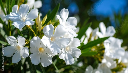 © Cintya, Fototapeta premium Close-up of White Oleander Flowers Blooming in Natural Garden Setting