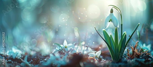 © Ilgun, Obraz premium Close up of white snowdrops Galanthus nivalis against a blurred background with copy space macrophotography Snowdrops bloom in the forest during spring