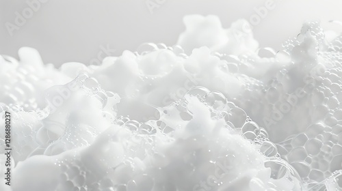 Fototapeta premium Close up of white soap foam texture on plain background with abstract patterns and bubbles