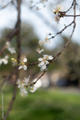 Obraz premium Close-up of white spring blossom on branch with soft bokeh background