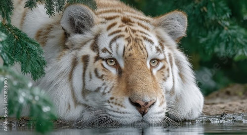 © Generative AI, Fototapeta premium Close-Up of White Tiger Resting Near Water, Symbolizing Wildlife Conservation and Endangered Species Awareness Campaign, a Call for Environmental Protection : Generative AI