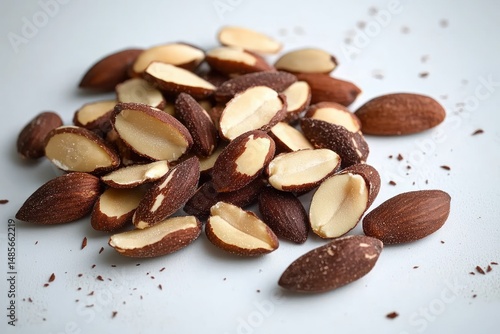 Obraz premium close-up of whole and halved raw almonds scattered on a white surface