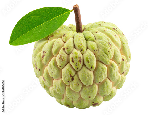 © Aminul, Fototapeta premium Close-Up of Whole Ripe Sugar Apple with Attached Green Leaf, Centered Studio Lighting, Transparent Background