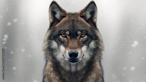 © Mufarokah, Naklejka premium Close up of wolf in snowy forest, looking at camera for nature related usage