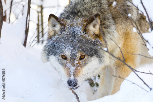 Obraz premium Close-up of wolf with wild eyes in winter forest