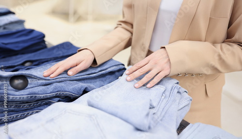 Fototapeta premium Close-up of woman choose jeans in trendy store, decide between different...