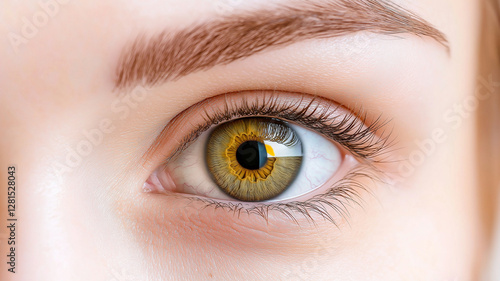 © Quality One , Obraz premium Close up of woman eye showcasing intricate details and vibrant colors, reflecting unique pattern. eye beauty captivates with its striking features and depth
