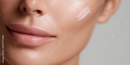 Obraz premium Close up of woman face with glowing skin and cream detail