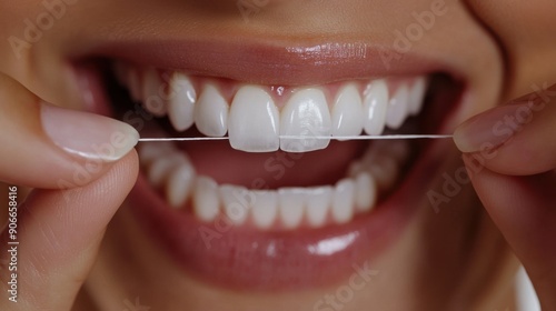 Fototapeta premium Close-Up of Woman Flossing Teeth