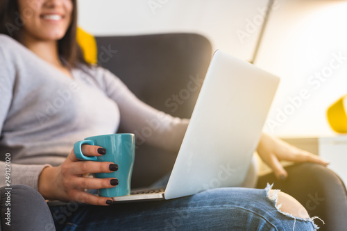 © cherryandbees, Naklejka premium close up of woman holding cup of coffee and laptop