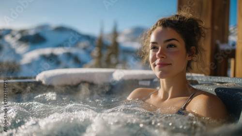 Fototapeta premium Close-up of woman relaxing in outdoor hot tub, snow-covered deck and mountains around, steam rising from warm water, crisp winter air contrasting cozy warmth