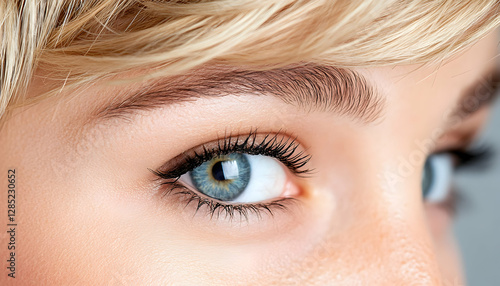 Fototapeta premium Close-up of woman's blue eye, blonde hair, beauty