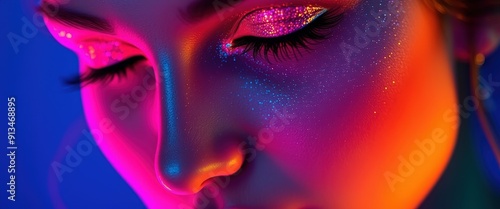 Fototapeta premium Close Up of Woman's Eye with Neon Glitter Makeup.