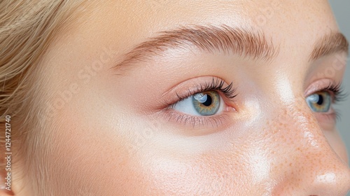 Fototapeta premium Close-up of woman's eyes, freckles, and brows. Beauty, skincare advertisement
