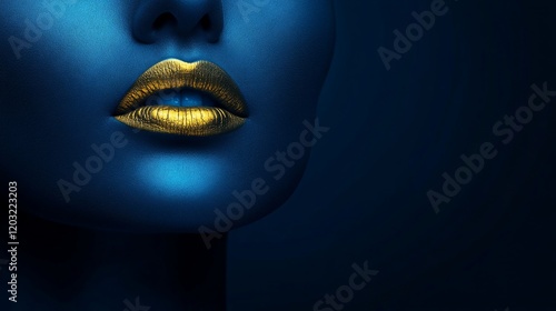 © NAIMAH, Naklejka premium Close-up of woman's face with gold lipstick, dark blue background.