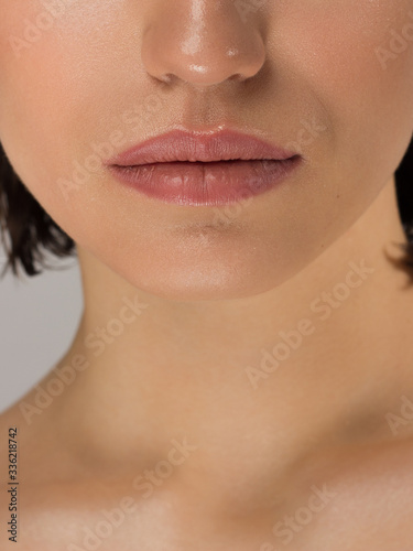 © evgeniyasht19, Obraz premium Close-up of woman's lips with fashion natural beige lipstick makeup. Macro sexy pale lipgloss make-up . Gentle pure skin and wavy blonde hair. Cosmetology, Spa, increase in lips. Face powder