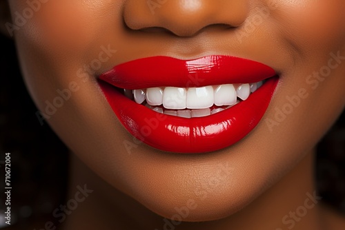 Obraz premium Close up of woman s perfect red lips and white teeth, beaming a super...