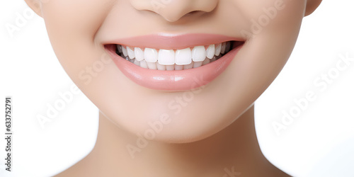 Obraz premium Close-up of woman's smile with white bleached teeth isolated on flat light...