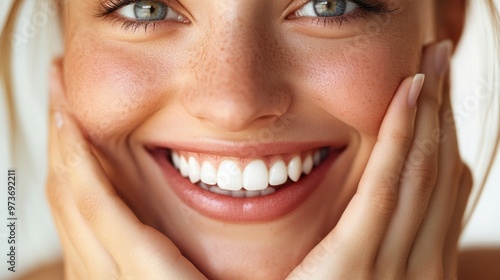 Obraz premium Close up of woman's smiling face with freckles, showing off her white teeth.