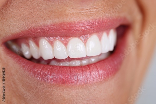 © ProStockPhoto, Fototapeta premium Close-up of Woman's Smiling Mouth Revealing Healthy White Teeth with Subtle Pink Lipstick for Dental Health and Beauty