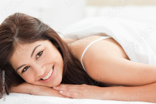 Fototapeta premium Close up of woman with her head tilted to the side looking forwa