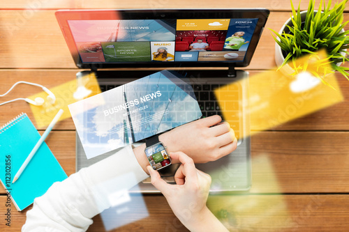 © Syda Productions, Fototapeta premium close up of woman with smart watch and laptop