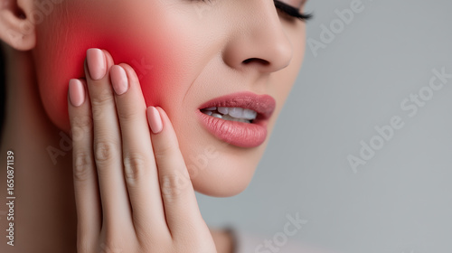 Obraz premium Close-up of woman with toothache touching her cheek, concept of dental pain,...
