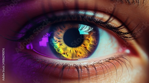 © JuliaDorian, Fototapeta premium Close-up of Womans Eye with Colorful Iris and Long Black Eyelashes