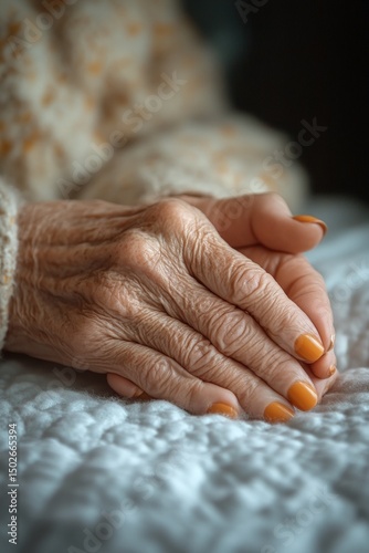 Fototapeta premium Close-up of wrinkled hands resting on a light-colored blanket, with orange nail polish